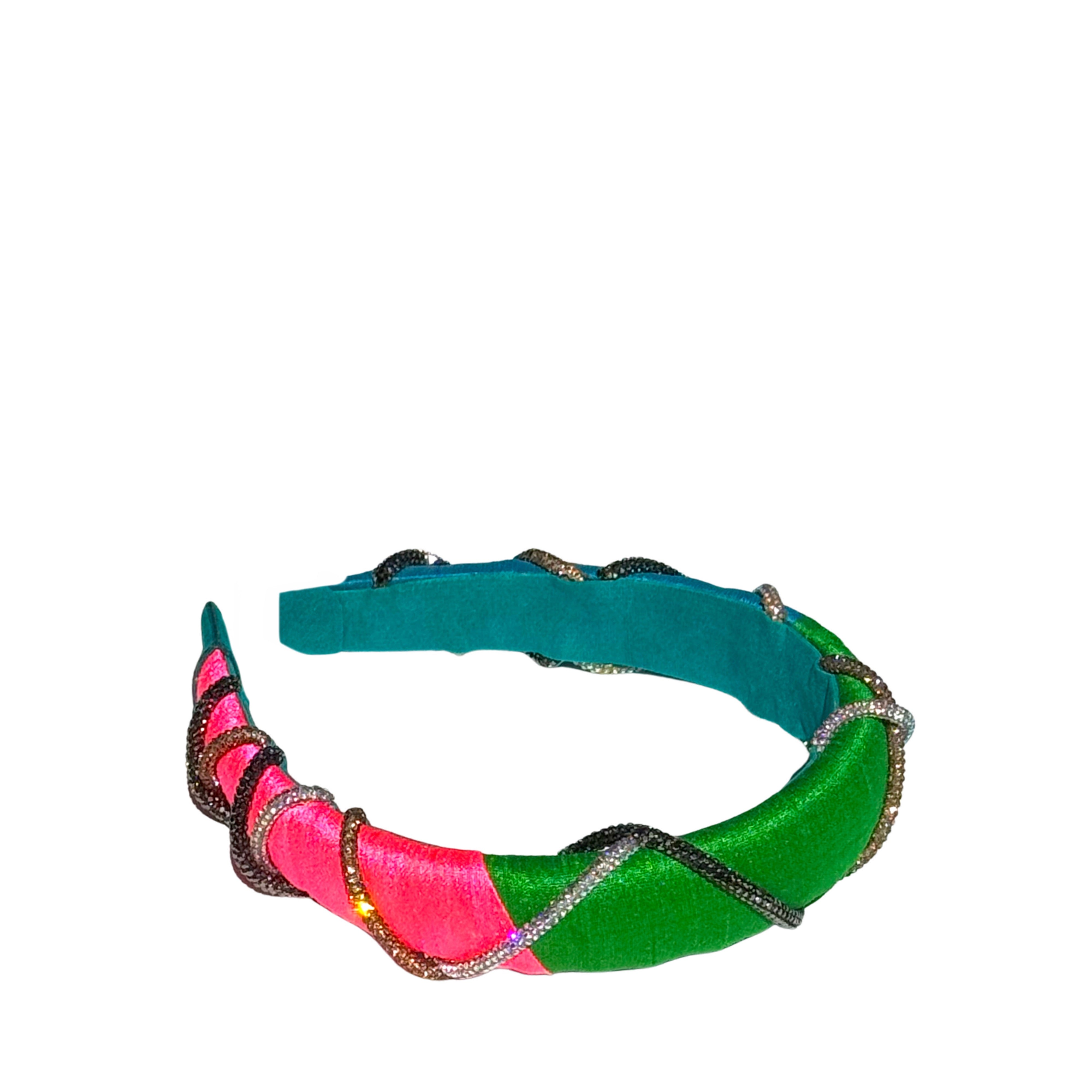 - Multi-colored color block fabric headband with hand-embroidered crystal rope detailing and is finished with soft velvet on the back for comfort.