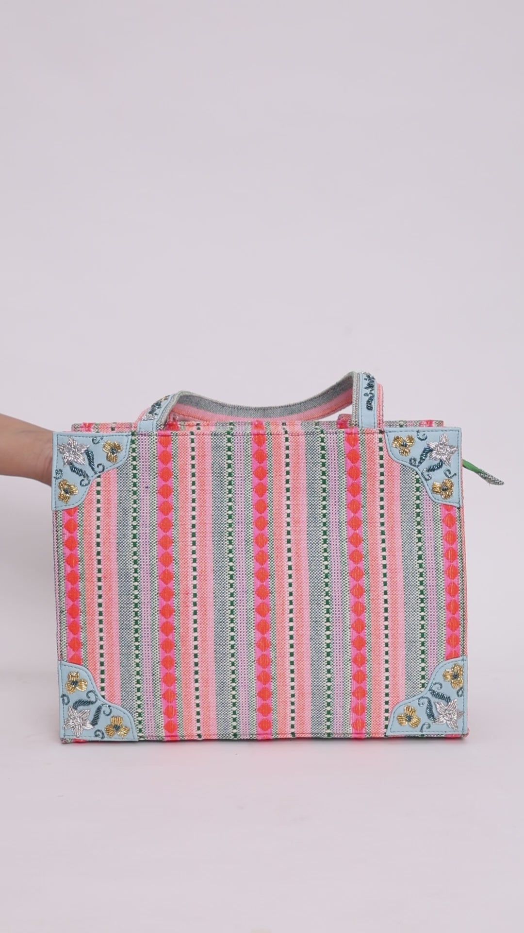 Kinara tote bag stays in your corner brightening things up no matter your style for the day. A nod to Simitri’s archives, this tote bag with a zipper is embellished with hand-embroidered zari botanical motifs, and brings a touch of India’s rich artistry to a striped woven fabric in hues of blues, reds, and pinks. Whether you're chasing urban adventures or seaside escapes, this tote’s eclectic charm screams jet-setter chic.
