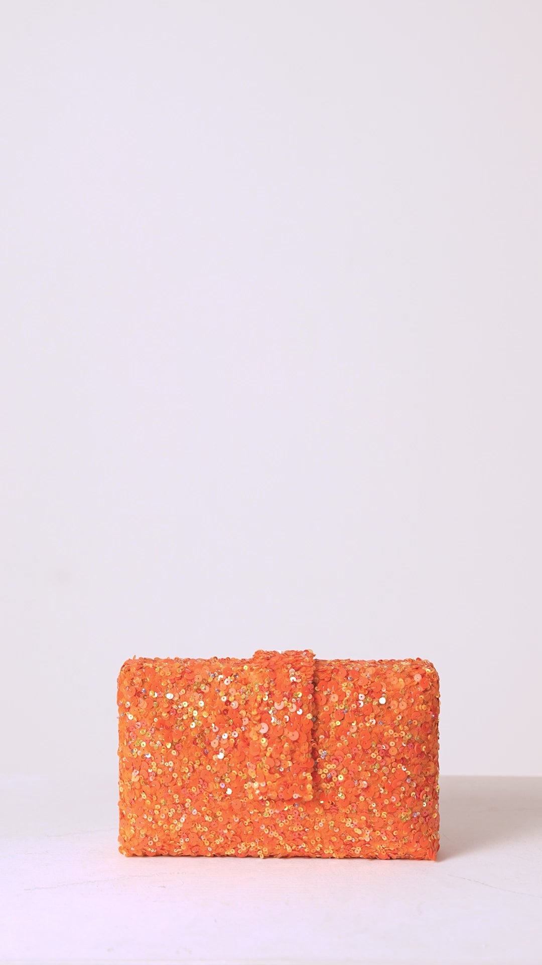 - Multi shaped orange sequins hand embroidered clutch with a magnetic belt flap as closure