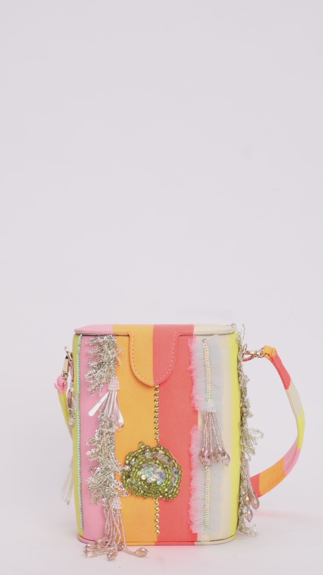 - Multi colored cylindrical shaped bag with hand embroidered sequin & thread patches & tassels hand stitched all over