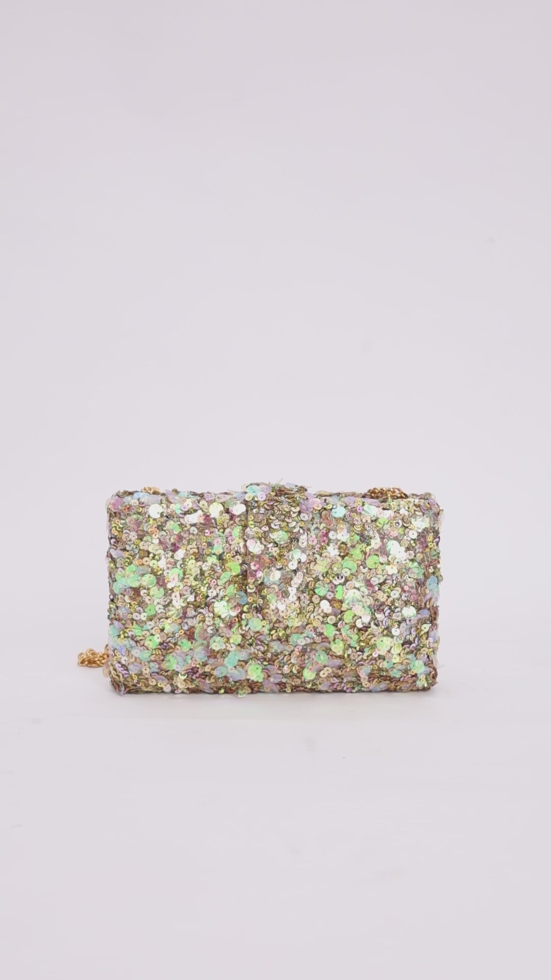 - Multi shaped gold & green sequins hand embroidered clutch with a magnetic belt flap as closure