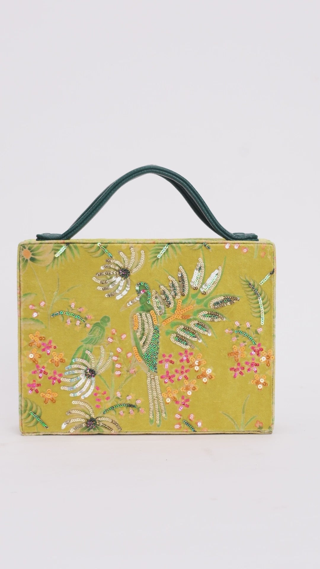 - Velvet briefcase bag with hand embroidered sequins highlighting the printed fabric