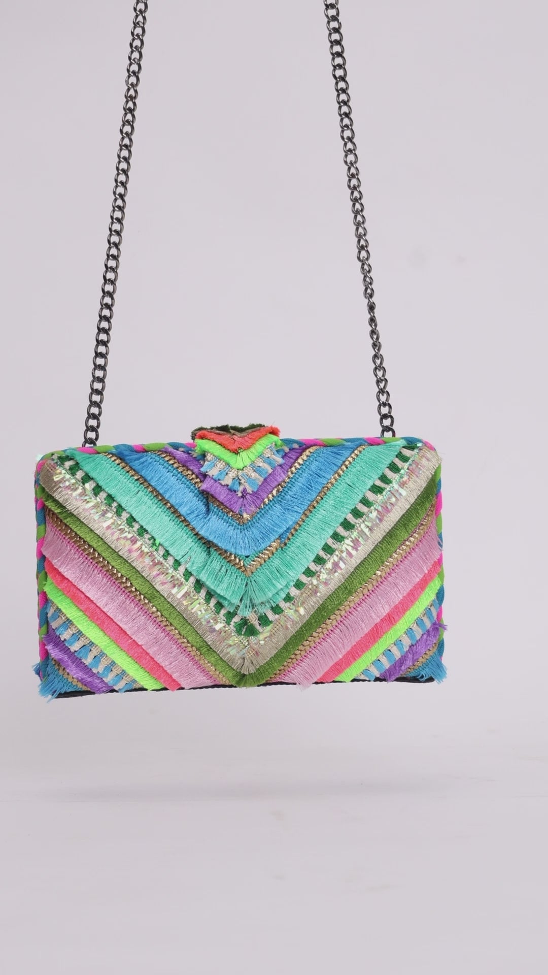 The multicolored fringe trim laces are placed to create a dynamic V-pattern giving this playful clutch a geometric feel and focal point that draws the eye. This bold, fringed purse shows off our structure in chaos design philosophy. Needless to say you’ll be showered with compliments. A versatile clutch to complement spring summer outfits and tailored separates alike. It is a clutch-worth choice for carnivals and music festivals, beachside galas, resort soirées, where vacation vibes meet high style.