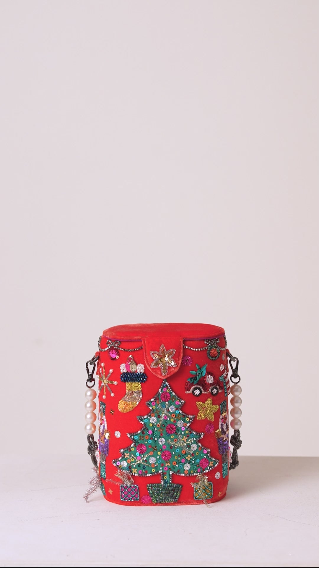 Unwrap the ultimate holiday accessory with the Ugly Christmas Bucket Bag—a festive twist on our beloved bucket shape. Plush red velvet and adorned with hand-embroidered motifs of all things quintessentially Christmas, this unique bucket bag is a piece of art. With two versatile straps—a knotted crystal strap for a dash of holiday sparkle and a longer shoulder strap—this bucket bag goes beyond the usual holiday kitsch. It's a conversation starter and a unique gift for your Christmas-loving BFF or the stylish hostess cousin who always brings the cheer.